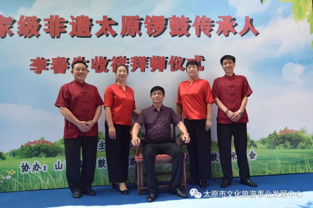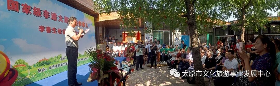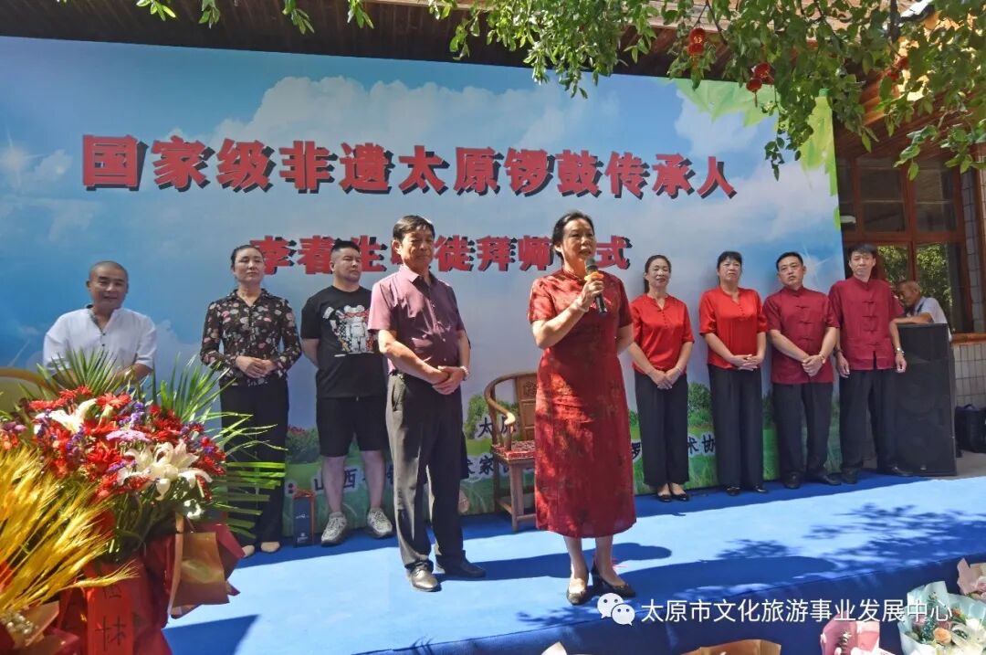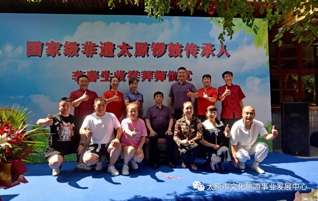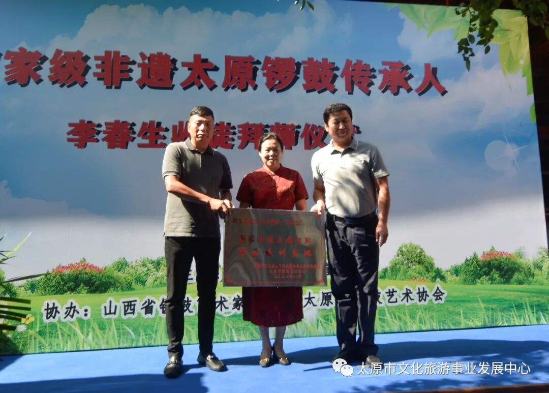 8月2日,由太原市文化旅游事业发展中心(市文化馆)主办,山西省锣鼓艺术家协会、市锣鼓艺术协会承办的“国家非遗——太原锣鼓传承培训基地授牌暨李春生收徒仪式”在小店区刘家堡金鼓园举行,主承办方负责人及省市锣鼓艺术家、文艺界相关领导出席并讲话。